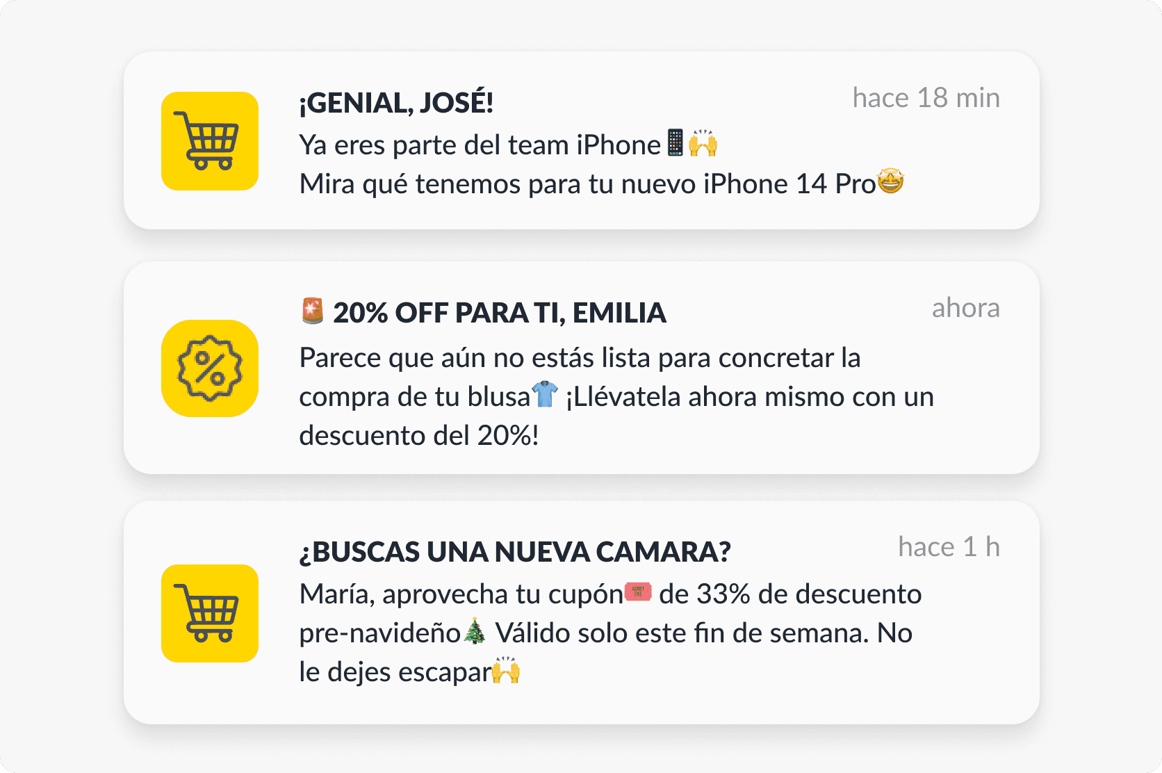 Te recomendamos que ofrezcas en tus comunicaciones sugerencias de productos basadas en el estilo y el gusto de cada comprador.Tus notificaciones personalizadas con el contenido dinámico pueden atraer atención con la mención del nombre del usuario, del producto que ha comprado antes, ha visto, ha añadido a favoritos o ha dejado en el carrito.