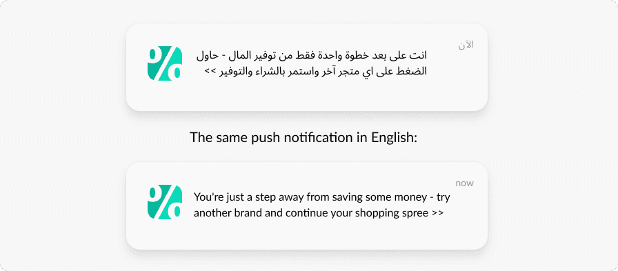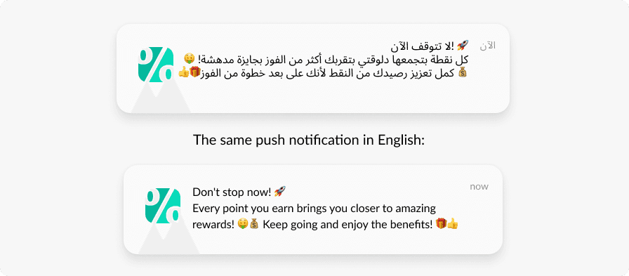 - Personalization: differentiating messages by language: if a user speaks Arabic, a message will be sent in Arabic; otherwise the message will be sent in English;